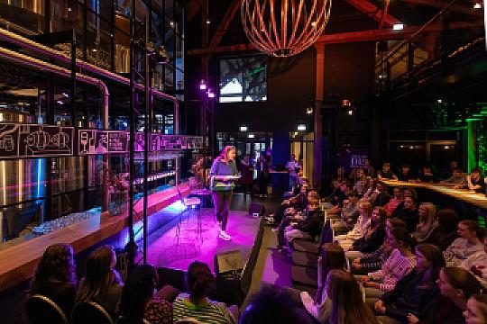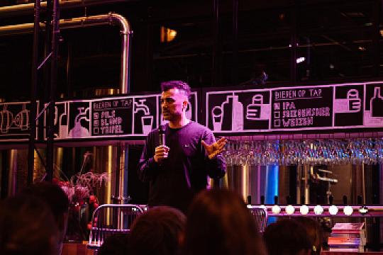 Terwijl de scholieren terug naar school of naar huis gingen, is Brouwerij Dockum klaargemaakt voor het middag- en avondprogramma. Iris de Graaf, Peter Buwalda, Anne-Goaitske Breteler, Karin Sitalsing, Arnold Veeman en Blaudzun betreden het podium, waar presentatrice Kirsten van Santen hen het vuur aan de schenen legt.
